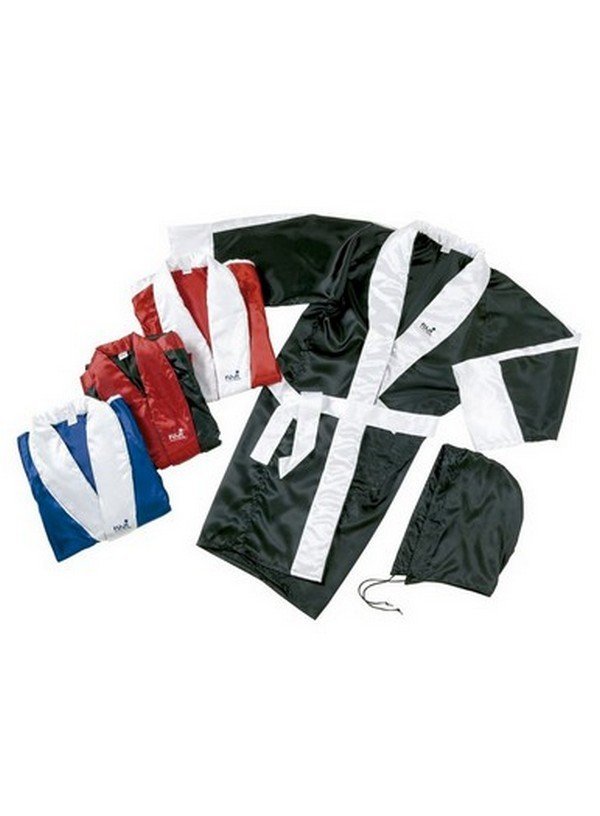 Bata de boxeo, de estilo clásico, confeccionado en tejido satinado bicolor brillante; corte ancho para ayudar a vestir. El cuello está acolchado, todos los detalles son diferentes al color del camisón, como las mangas o los cinturones de los bolsillos. Incluye capucha, cinturón y bandolera opcionales como accesorios. • Corte ancho. • Paño de raso 100% poliéster. • Incluidos accesorios. • Fácil de limpiar y de secado rápido
