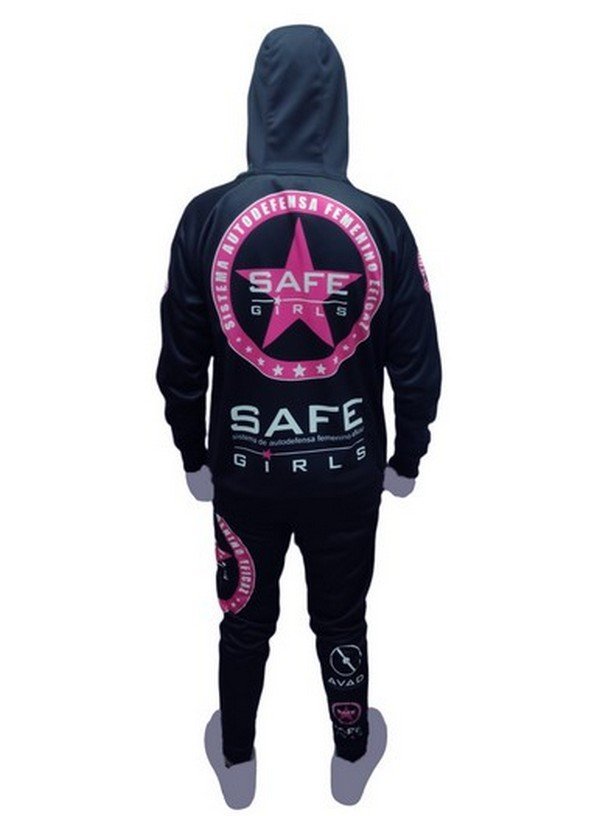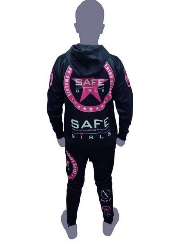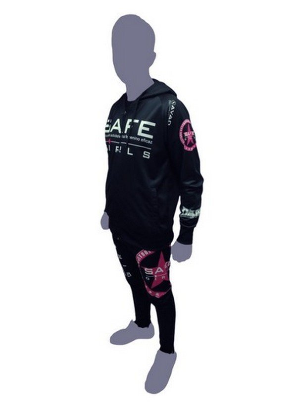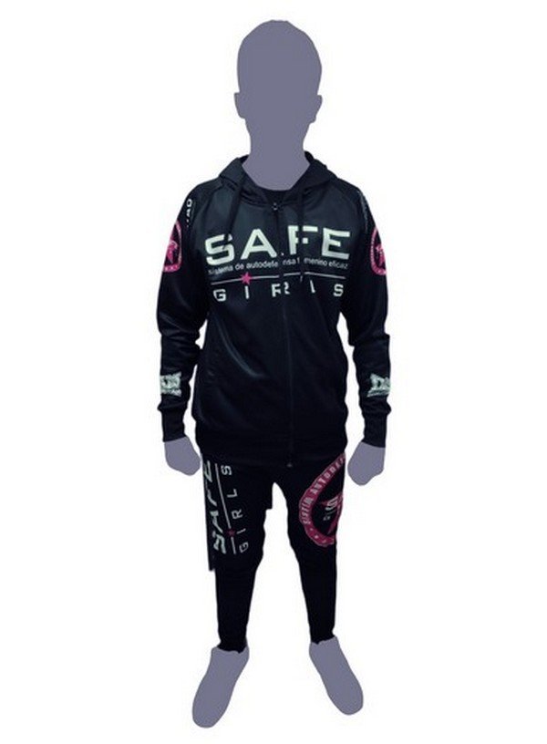 Chándal de la marca DAN con una excelente relación calidad/precio. De la colección de prendas "SAFEgirls". Incluye chaqueta con capucha y cremallera y pantalones con cordones.