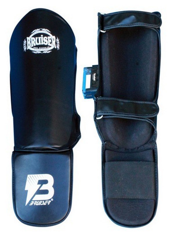 Espinillera de la marca Bruiser. Fabricadas en neopreno de color negro, molde de espuma, modelo tubular. La mejor opción para evitar lesiones.Sujeción mediante correas elásticas con velcro.