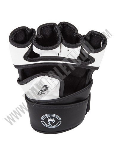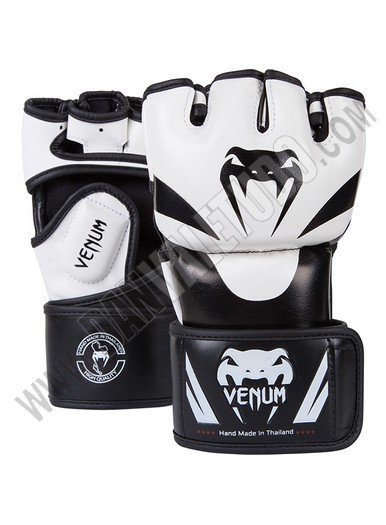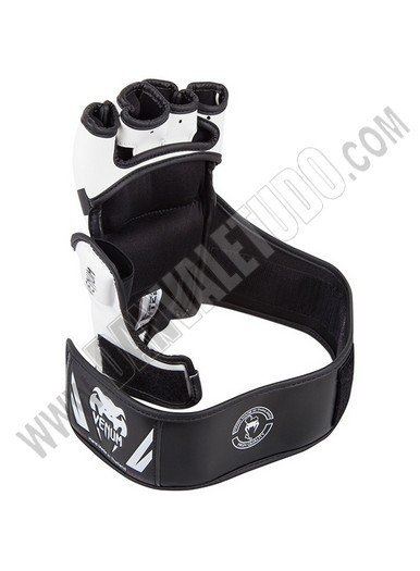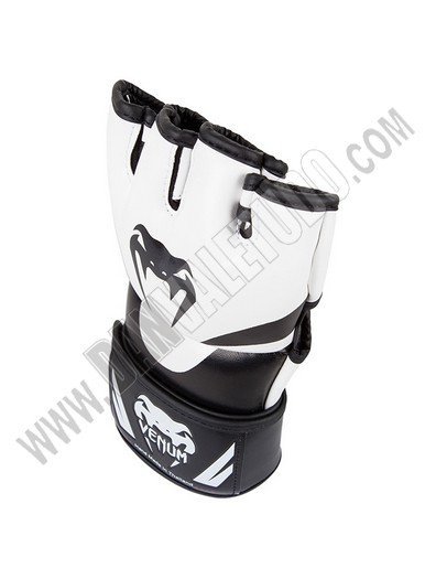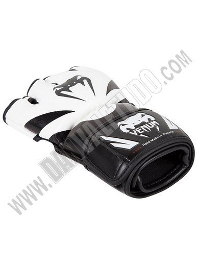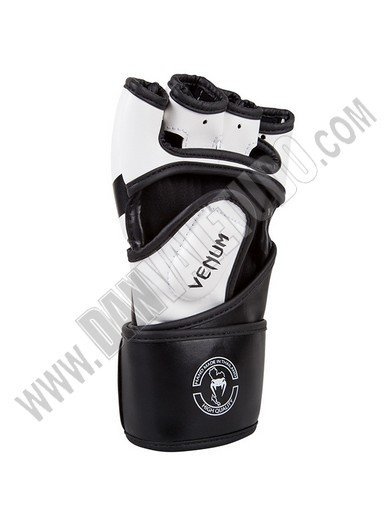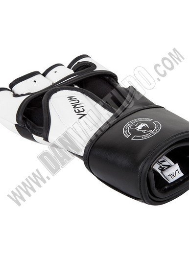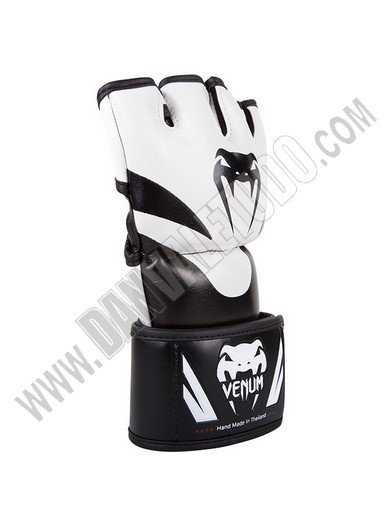 Guantillas para MMA de la marca Venum, hechos a mano en Thailandia, fabricados con piel Skintex Premium que garantizan máxima durabilidad, además con su espuma de alta densidad ofrece protección para todos los dedos incluido el pulgar. Tiene un sistema de sujeción doble que da mayor soporte y protección a la muñeca, ya que anula las lesiones de torsión. Están deseñadas con un estilo mas agresivo presentando el logo de la marca en los nudillos.