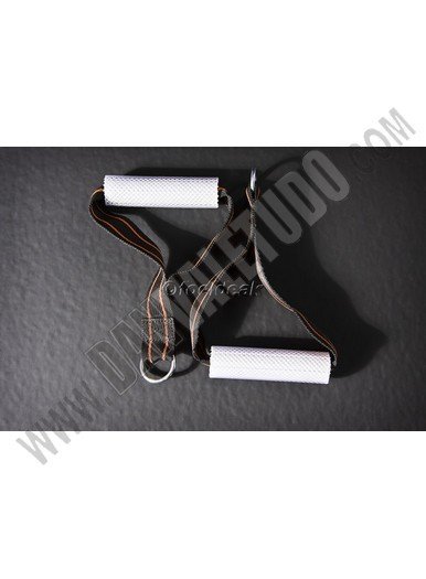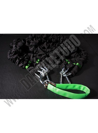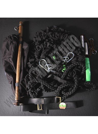 Tres tubos de látex (color: negro, 3 m de largo, cubierto por la manga de seguridad, uno de los extremos se utiliza como un ancla y el otro propósito se adjunta a una cuerda negra). 1 cuerda negra (5 m de longitud, 22 mm de diámetro, el interior de la cuerda es de material sintético con una cubierta de polipropileno negro). Una barra de madera (80 cm de longitud, 40 mm de diámetro, hecha de madera de haya). La fijación de presilla (color verde). 2 mangos. Una correa de cuerpo para sujetar a la cintura o las piernas. Una mochila de tela. Ver video1 , video2 , video3