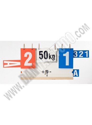 Marcador portátil compacto y mecánico. Fácil de instalar en una tabla de puntuación y totalmente transpotable.Cumple con el Reglamento FILA. En las categorías de peso incluye todas las clases de peso típicas, se puede ampliar o reducir según las necesidades personales. El tamaño del marcador: 570 x 340 mm. Tiene anillas para presentar el minuto actual de lucha. Funciones: puntuación, rondas ganadas, tiempo. Visualización de hasta 3 faltas. Visualización de hasta 3 rondas ganadas.