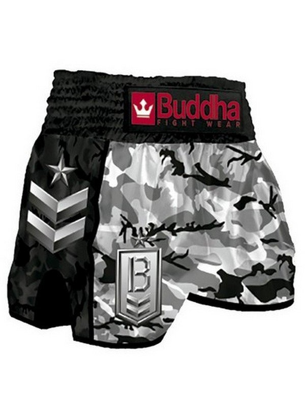 Pantalones cortos de la marca BUDDHA con diseño retro en color camuflaje gris.