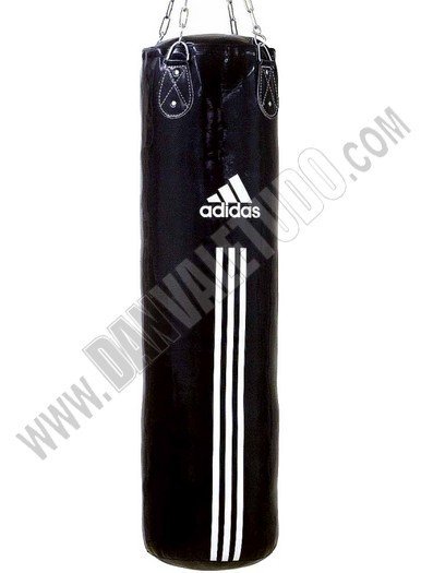 Saco relleno de la marca Adidas de 1.2mm de espesor, relleno de material textil unicamente y escaneado. Tiene cremallera en la parte superior . Viene con las cadenas que tienen un acabado galvanizado y además giratorio. Las medidas son 120cm x 33cm de circunferencia.